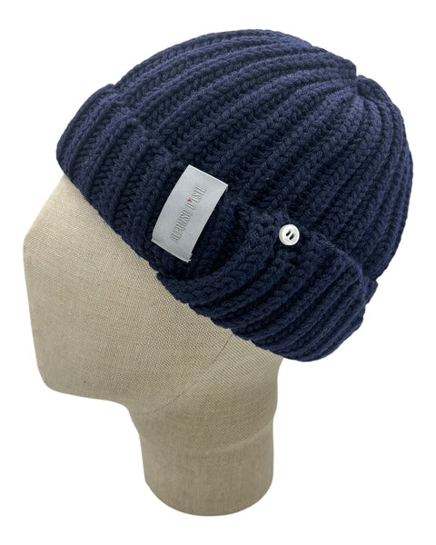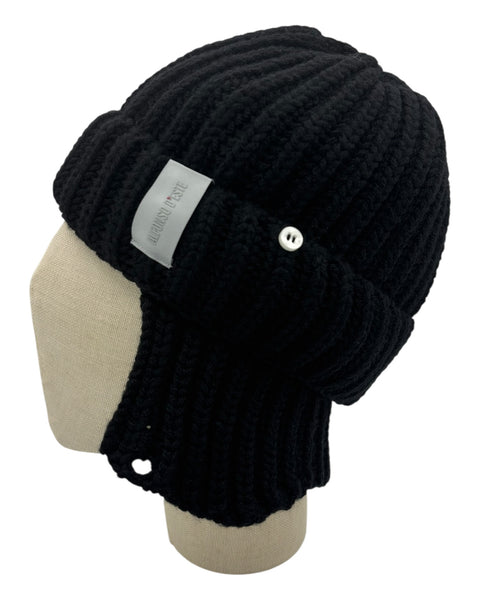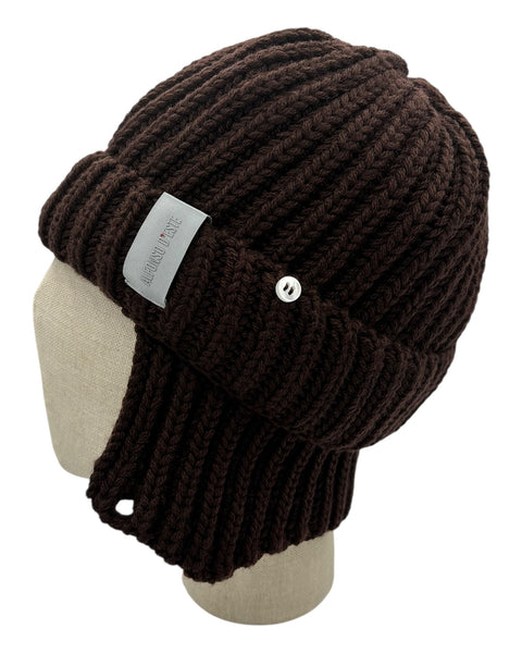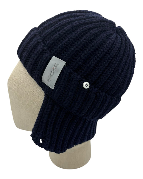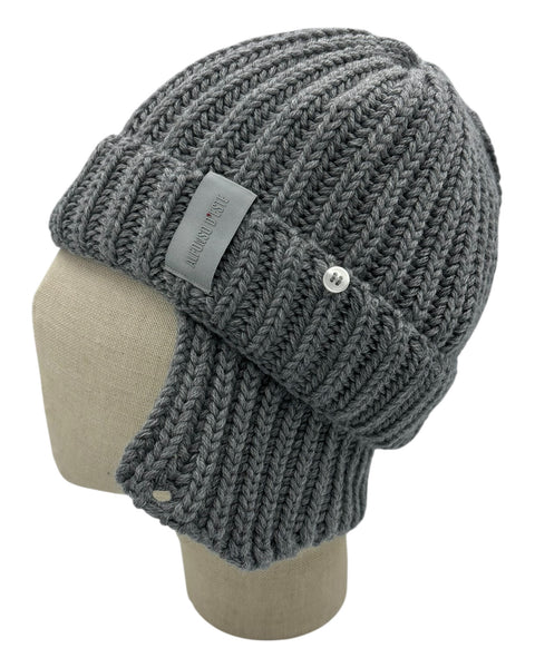 Cuffia Alfonso d’Este in pura lana con risvolto e paraorecchie esterne con bottoncini. Taglia unica.